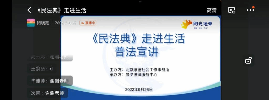 为继续深入开展“迎接二十大 送法进万家”主题普法宣传活动,切实让《民法典》走到群众身边,走进群众心里,营造学习法典、运用法典、崇尚法典的浓厚氛围,9月26日上午,由ylzz总站线路检测中心法律援助协会负责人周雨欣带队,成员陶晓霞主讲,携手成员贾赫宇、李宛营,共同参与了由北京市西城区司法局主办、晨夕法律服务中心协办的直播普法活动,为社区2600余名居民带来了“《民法典》走进生活”主题普法宣讲。