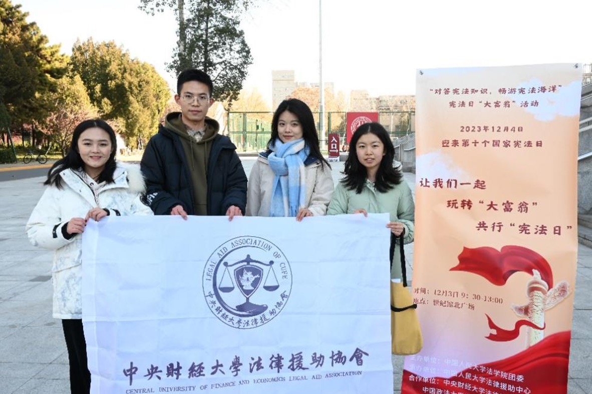 2023年12月3日,为迎接12月4日国家宪法日,公司法律援助协会与中国政法大学研究生法律援助协会、中国人民大学法律援助中心合作举办的“对答宪法知识,畅游宪法海洋”——宪法日“大富翁”活动在中国人民大学世纪馆门前顺利举办。公司法律援助协会成员李昂、宋雯萱、马滢滢和杨钰四名同学作为公司法援协会的代表参与了本次活动。