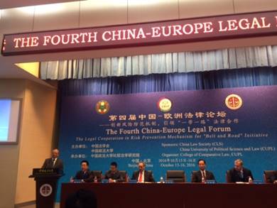 2016年10月15日至16日,第四届“中国-欧洲法律论坛”在中国政法大学学院路校区学术讲堂隆重举行。本次论坛由中国法学会和中国政法大学联合举办,论坛主体题是“创新风险防范机制,引领‘一带一路’法律合作”。公司副经理王克玉副教授应邀出席会议,并做论坛发言。