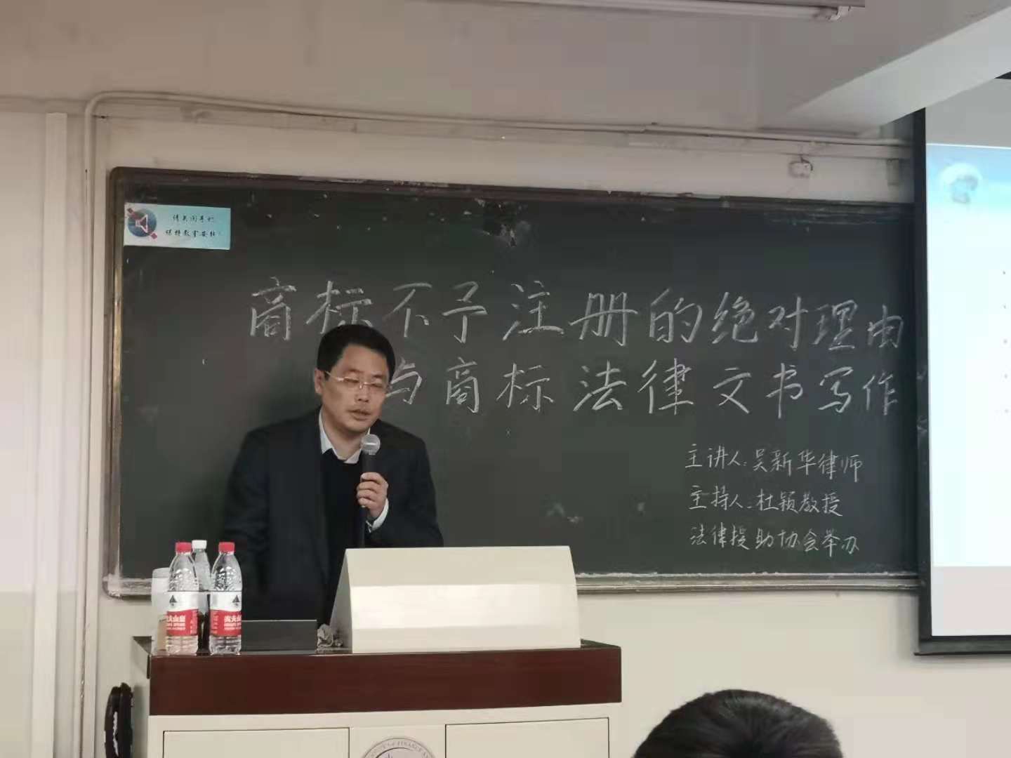 在阐述商标注册申请的实质性审查时,吴新华律师对商标不予注册的绝对理由与相对理由做出了讲解。吴新华律师指出了商标申请不予注册的几种情况,如不符合显著性、合法性,缺乏显著特征的标志,宗教、国家机关相关性等情形。同时他还强调了几种例外情形,如介绍客观存在的名称、经国务院或授权机关批准等。吴新华律师以其经手的大量案例极大地提高了同学们的积极性。随后吴新华律师以法律文书写作中制作的合法性、形式的程式性、内容的法定性、语言的精确性为基础,简要介绍了商标法律文书种类之丰富,要求之细致,时限之严格。