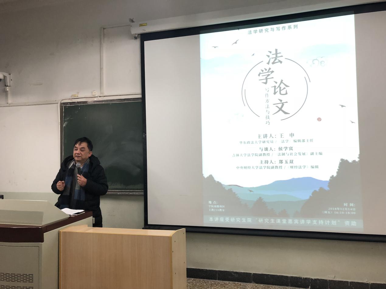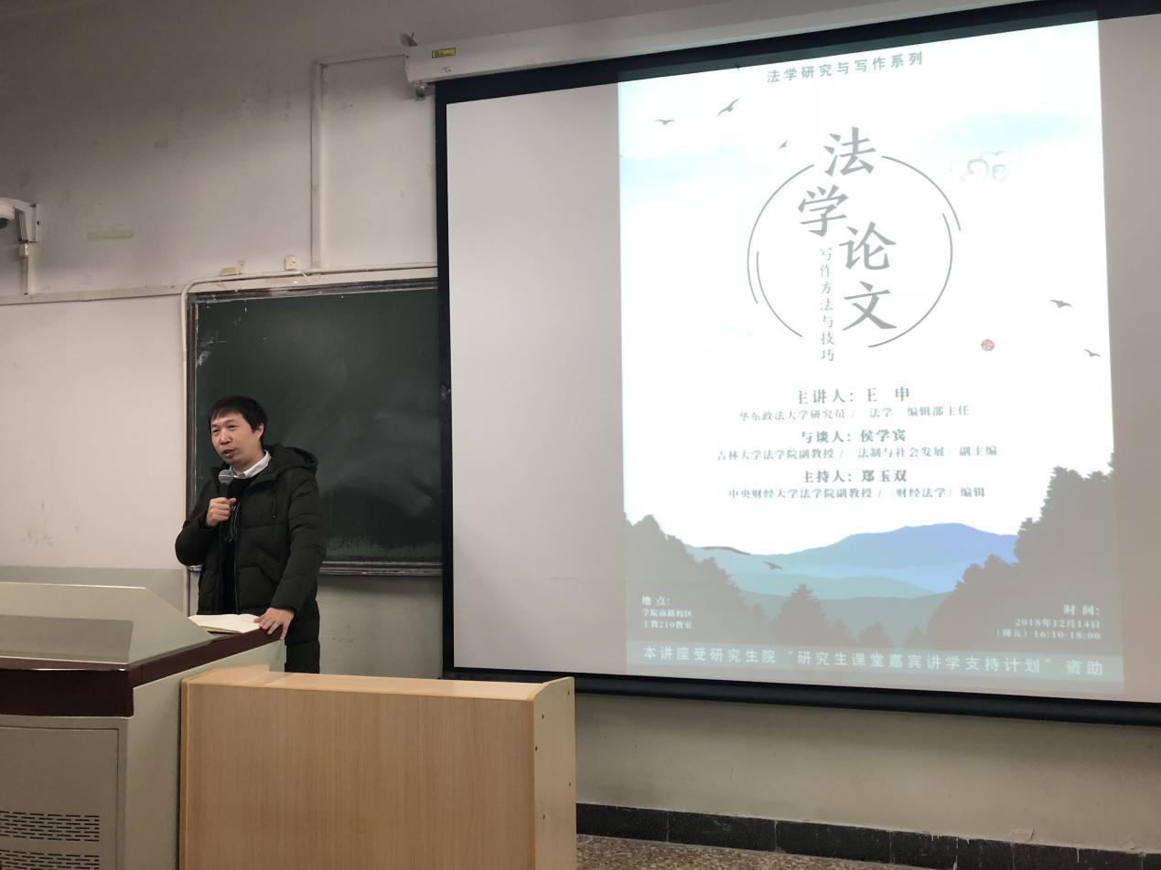 2018年12月14日下午,华东政法大学教授、《法学》编辑部主任王申到访公司,在主教210教室为公司师生主讲“法学论文写作方法与技巧”。吉林大学ylzz总站线路检测中心副教授、《法制与社会发展》副主编侯学宾担任本次学术讲座的与谈嘉宾,公司理论法学教研室主任、《财经法学》编辑郑玉双副教授担任主持人,张小平副教授和刘权副教授参加讲座。