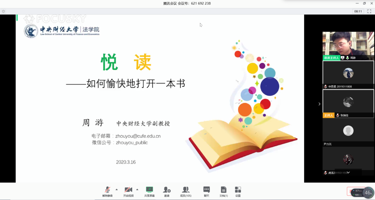 2020年3月16日,公司周游副教授分别于上午10点和晚上7点半,为学院师生带来了两场战“疫”期间别样的讲座:悦读——如何愉快地打开一本书。本次讲座作为公司2019-2020学年“新生引航工程”系列讲座之一,吸引了众多师生参与其中,公司党委副书记徐颖研究员、部分学科专任教师、各年级班主任和辅导员、全体2019级本科及研究生新生共计400余人,通过腾讯视频会议软件共同领略了读书背后的奥妙。
