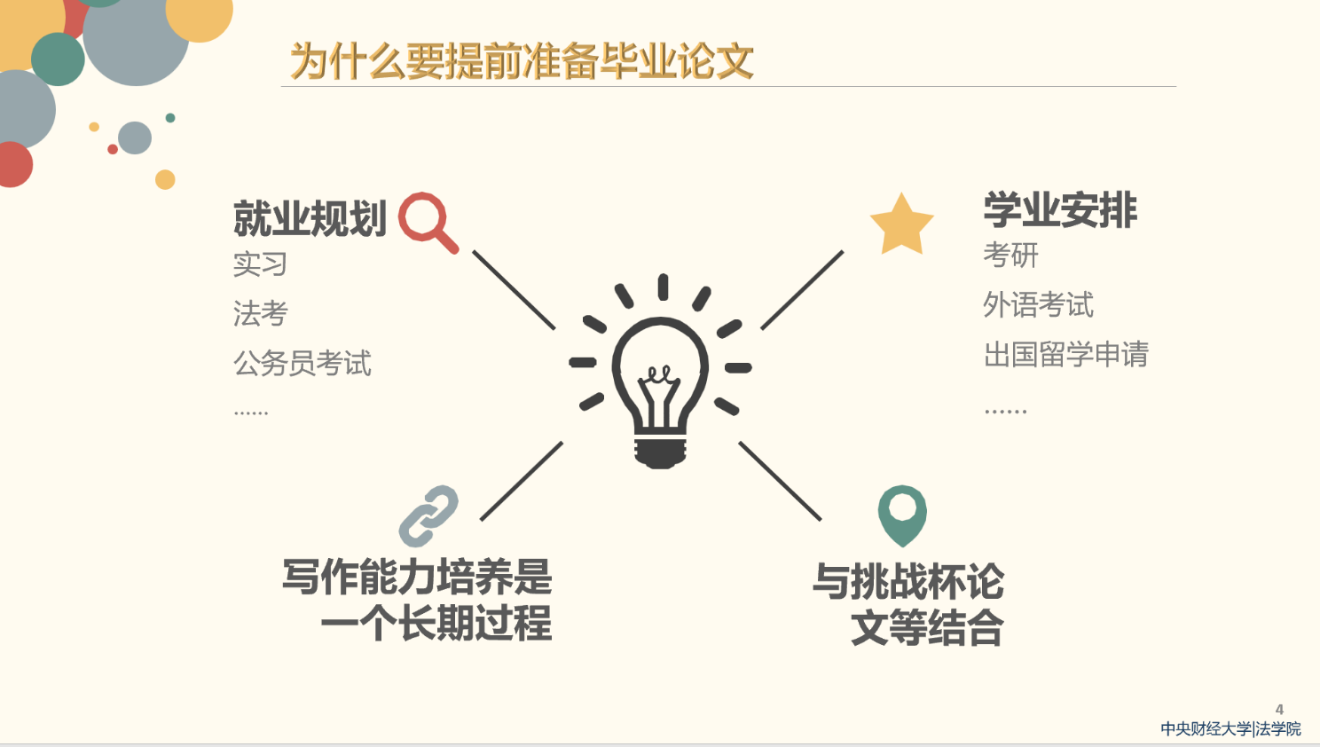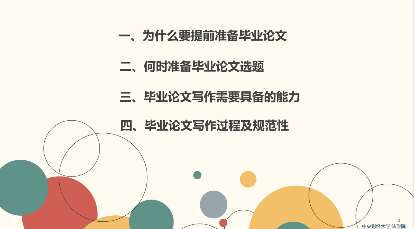 就提前准备毕业论文的原因,简爱博士指出,目前到毕业间隔时间不长,提前准备论文具有必要性。具体而言原因有四:一是老员工活基于高密度的就业规划、实习、法考等,应该提前规划;二是学业安排的准备方向多样化,如考研、外语考试、出国留学申请等,提前准备毕业论文可为后期学习预留时间;三是论文写作和挑战杯等大赛都要求员工掌握文字的基本功;四是写作能力培养是一个长期的过程,规范写作能力养成,论文选题等需要长期规划。简爱博士强调,毕业论文写作之所以如此重要,是因为它是专业知识运用的检测、科学研究基本功的塑造以及取得学位的必由之路。