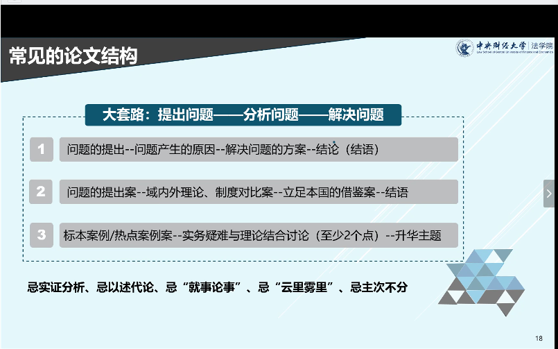 同时,针对研究生,简爱博士还分析了常见的论文结构。论文结构主要的大套路就是“提出问题——分析问题——解决问题”。第一种论文结构形式表现为:“问题的提出——问题产生的原因——解决问题的方案——结论”,这一逻辑比较通畅,是论文写作中比较普遍的结构;第二种论文结构为比较分析法:“问题的提出——域内外理论、制度对比较——立足于本国借鉴——结语”,这一结构虽有比较,但是最终还是要回到我国的立法实践;第三种论文结构即“标本案例——实务疑难与理论结合讨论——升华主题”。同论文选题一样,论文结构也要切忌实证分析、以述代论、“就事论事”、“云里雾里”、主次不分。