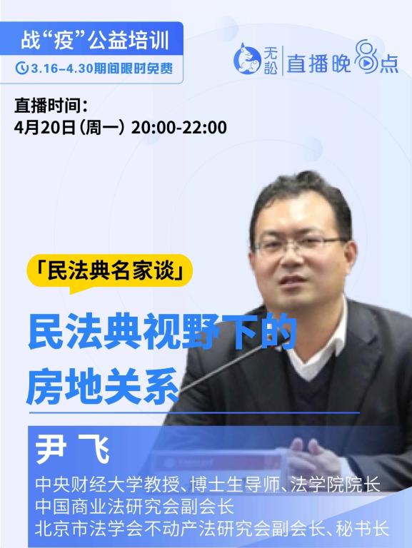 此前,应北京东卫律师事务所邀请,尹飞教授于4月10日出席了其“东卫大讲堂”公益直播活动。
