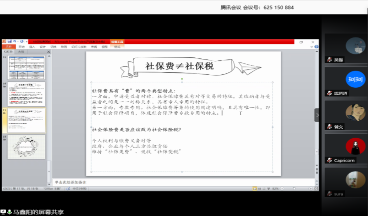 2019级法律硕士研究生马鑫阳同学从税的概念、分类入手,对相关概念进行了简略阐述,联系当前“社保入税”的新政策,对社会保险费的性质进行了辨析,并进一步延伸至“税”与“费”的区分,强调了社会保险费具有申请受益者对称、专款专用两个“费”的典型性特点,不能简单等同于社会保险税。