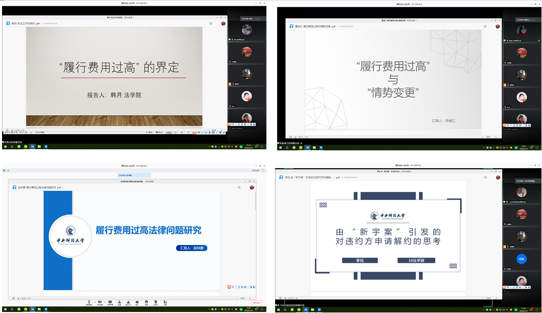 在发言人展示间隙,公司2019级硕士研究生蒋睿、程相宜、张俏和安悦齐分别对四份报告进行了评议。蒋睿指出韩月的报告层次分明,内容详实,比较现实地回应了司法实践中的一些难题,同时对报告的结构提出修改建议。程相宜首先对鲁城江的报告予以肯定,并且分享了自己对情势变更标准的看法,即目前适用情势变更判决的案例很少,可见适用情势变更制度的要求很严格,因此选取债务人利益显著低于成本作为标准对债务人过于有利。此外,程相宜建议在民法典去掉非不可抗力的要件之后,报告中应当对情势变更、履行费用过高和不可抗力的交叉一并予以讨论。张俏在赵林静报告的基础上,对目前履行费用过高比较对象的各种学说进行体系化梳理,并对报告中借鉴最高人民法院关于民间借贷利率的限制性规定,以及合同法解释(二)中确定的明显不合理高价的解释标准,类推适用后得出的当履行费用达到债权人履行利益的130%时认定为过高的结论进行了批判。安悦齐认为李钰的报告论证明晰、说理有据,并指出违约方解除权不应在立法上得以确认,但有必要规定重大事由解除权。
