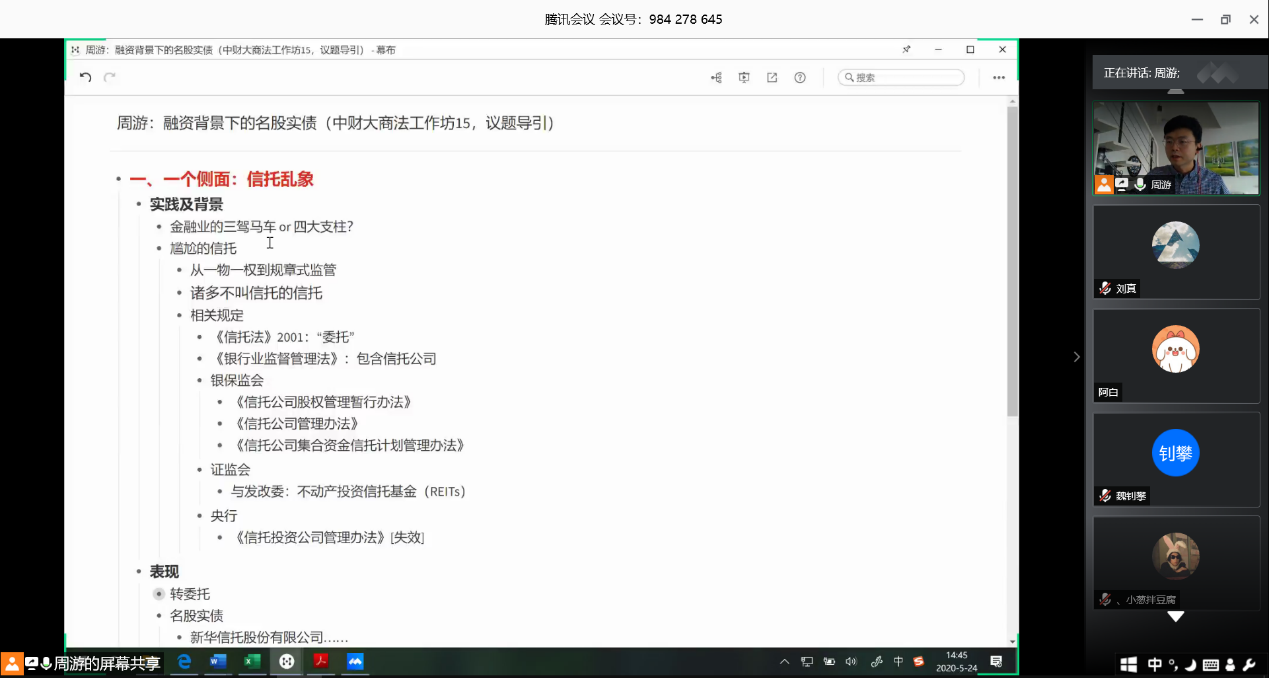 2020年5月24日下午,ylzz总站线路检测中心商法学研究工作坊2020年第7期(总第15期)在直播平台以线上交流与讨论的方式如期举行。本次活动议题为名股实债。中国政法大学民商经济ylzz总站线路检测中心讲师冀放博士、澳门科技大学ylzz总站线路检测中心助理教授彭运朋博士作为本期工作坊的特邀嘉宾,公司周游副教授作为指导老师参与了本次活动。工作坊主要由指导老师引导、发言人展示、成员及其他与会者提问及评价、评议人评议、特邀嘉宾发言、指导老师总结等环节组成。此次线上活动共有60余名校内外师生及业界人士参与讨论。