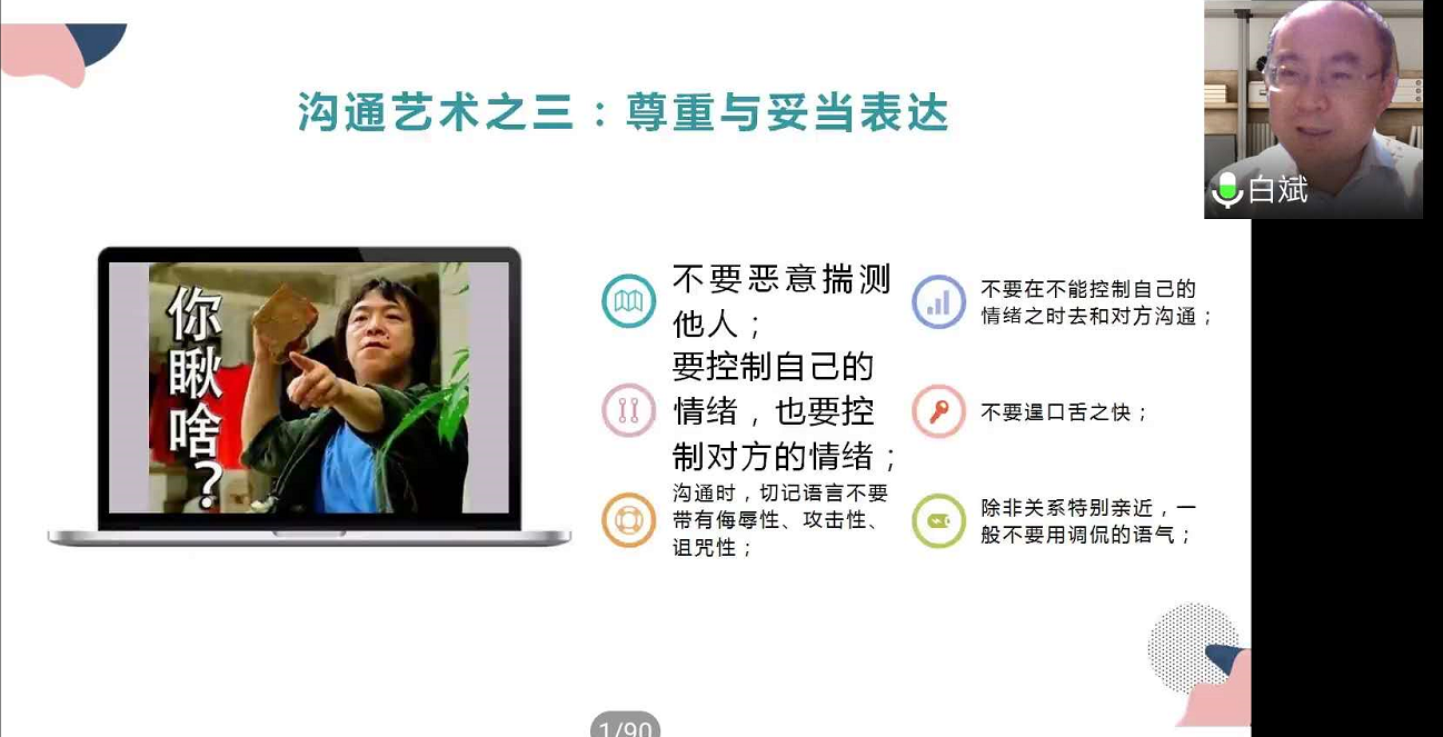 2020年5月31日晚上7点,公司举办“沟通的艺术”线上主题讲座,旨在指导员工学习沟通的方法,领略沟通的艺术。本次讲座为公司2019-2020学年“新生引航工程”系列讲座之五,由白斌副教授主讲,公司党委副书记徐颖研究员、周游副教授、简爱博士、各年级辅导员及2019级本科生和研究生共计约300人通过腾讯会议参加云讲座。