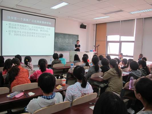 在金秋送爽、硕果飘香的时节,公司迎来了来自全国各地的11级新生,为了让同学们更好的了解公司以及法学专业、尽快的融入大学学习生活,公司举办了本场题为“法学的邀请”的专题讲座。出席讲座的有副经理刘双舟教授、张小平博士以及辅导员吴垠老师。本次讲座是11级新生入校以来第一场专业讲座。现场座无虚席,同学们怀着期待的心情等待着与老师的交流。