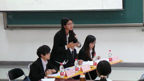 在主持人简要介绍参赛双方以及出席的评委,两方辩论队队员自我介绍后,本场辩论赛正式开战。首先是由公司一辩杨幸媛同学陈词立论。她准确地剖析了此次辩题的含义,并从功利色彩的本质以及其给现代生活带来的有利影响等方面完整地陈述了我方观点。紧接着,对方二辩立即反驳我方一辩,而接下来我方二辩沈明杰同学也有利地反驳了对方一辩的陈词。其后,经过双方三辩和四辩的激烈交锋,比赛来到了对辩环节。在此环节中,对方一辩针对我方辩题就功利色彩的增强会违背社会发展的协调性、可持续性以及会造成道德滑坡三个方面进行了盘问,而我方以发达国家的长期发展历程为例对此进行了有效地反驳。