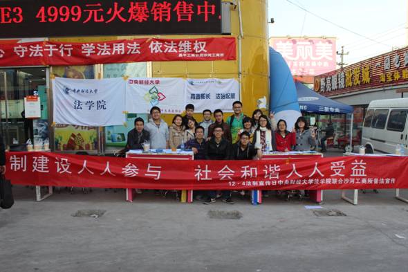 下午1时10分,普法宣传小组整装待发,在学校南门集合前往活动目的地。二十分钟的车程之后,普法宣传小组到达了沙河镇鑫之星市场。在相关准备工作做完之后,“12.4普法宣传活动”正式开始。