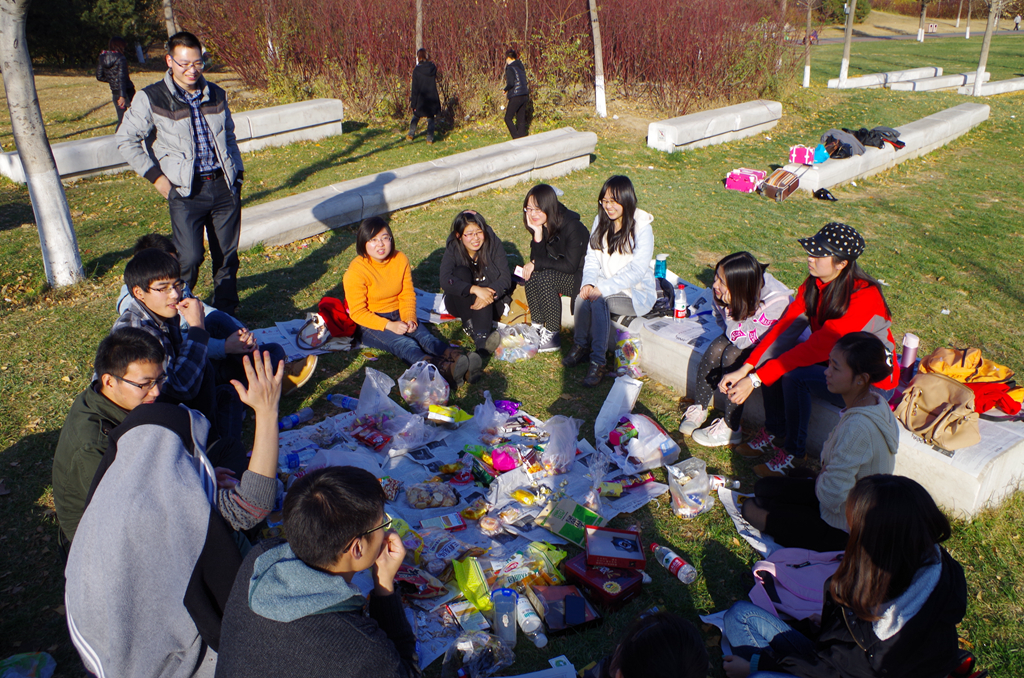 到达奥体公园后,我们找到了一片大草坪,一番整理之后,便有了“野餐”之态:地上铺满了报纸、报纸上堆满了食物、食物周围围聚着我们。在大家建议下,我们开始边吃午餐边做游戏。几局“蔬菜水果动物园”下来,一拨又一拨的同学甘愿领受“真心话大冒险”的惩罚,爆料出各种隐私,娱乐了大家,同时也加增进了彼此的了解。