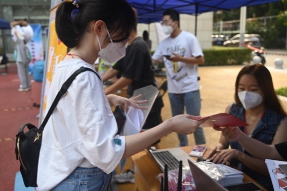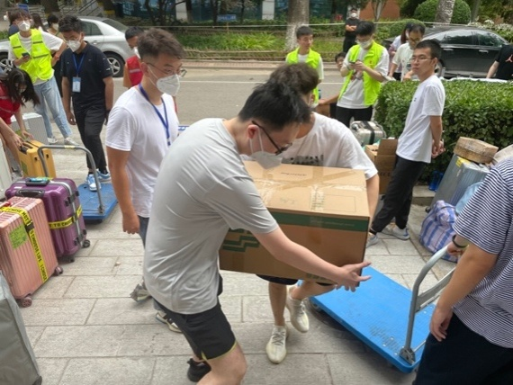 早上八点,研究生新生们陆续来到报到现场。负责迎新的同学们各司其职,帮助新生们迅速依次完成线上报到和照片上传、录取通知书和证件核验、报到材料领取,并向新生讲解注意事项。除此之外,帮忙搬运行李的志愿者也随时待命,每当看到提着行李的新生走近,他们都会主动上前接过行李,并帮忙搬到宿舍。报到现场有条不紊,高效进行。