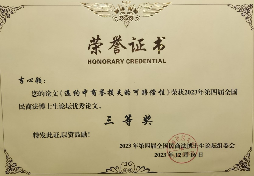 2023年12月16日,由西南政法大学民商ylzz总站线路检测中心、中国政法大学民商经济ylzz总站线路检测中心、华东政法大学法律学院、中南财经政法大学ylzz总站线路检测中心联合主办,西南政法大学民商ylzz总站线路检测中心承办的“第四届全国民商法博士生论坛”在重庆市西南政法大学渝北校区成功举行。经前期征文与专家评审,来自全国10余所高校的20余位优秀硕博士研究生、青年学者作为报告人受邀出席。公司21级法律硕士(非法学)研究生吉心颖投稿的论文《违约中商誉损失的可赔偿性》获评三等奖,并应邀作报告。