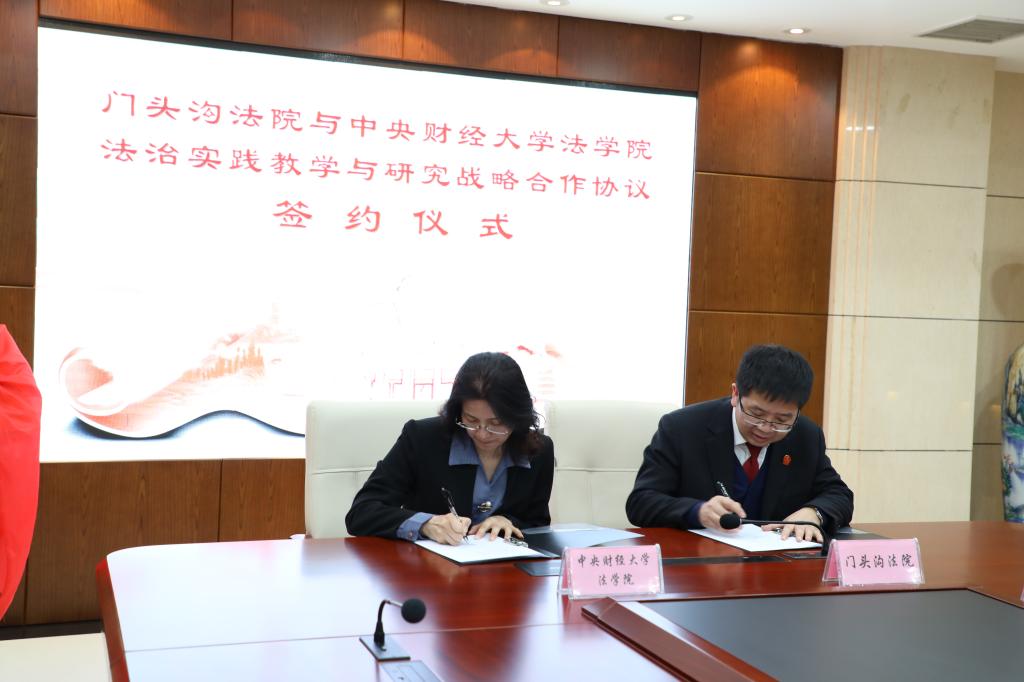 随后,公司党委副书记徐颖研究员与门头沟区人民法院政治处主任袁煜驰共同签署了《法治实践教学与研究战略合作协议》,经理尹飞教授与门头沟区人民法公司党组副书记、副经理安辉为校外实践基地揭牌。