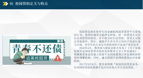 在宣讲中,两位主讲人通过通俗易懂的语言,辅以配图加深理解,将不良校园贷的常见形式及危害讲给观众,再通过展示案例的形式,提醒大家远离校园贷,并学会拿起法律武器维护自己的合法权益。