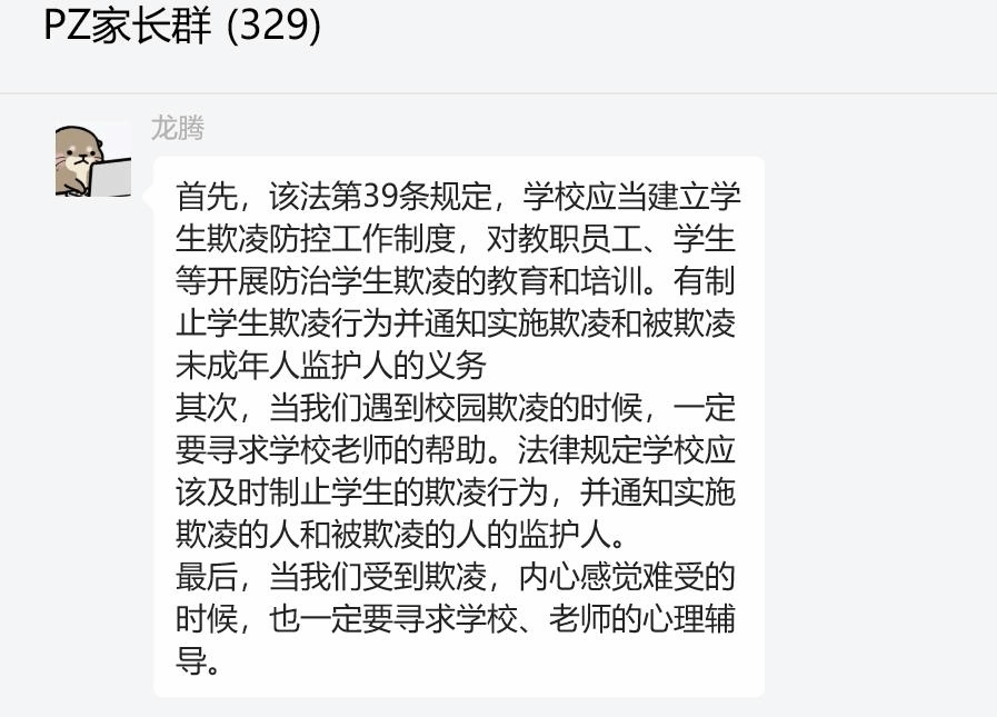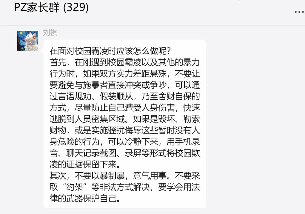 本次普法宣讲形式为线上宣讲,由两校志愿者进入社区微信群,发送自己制作的视频讲解资料,并强调和总结其中的重点内容。先由公司同学讲解未成年人校园欺凌的相关问题,再由中国政法大学的同学进行普及宪法知识的宣讲。